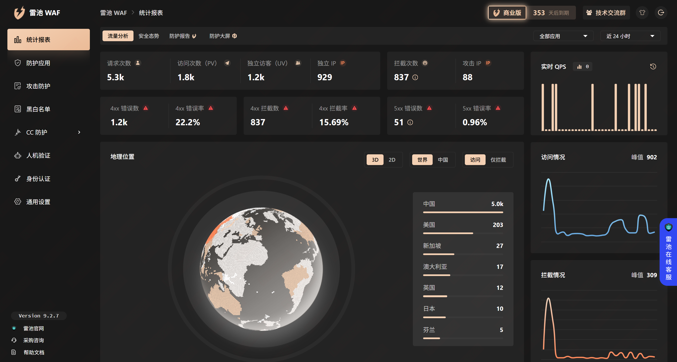 雷池免费版的功能也很全面,支持 SSO 单点登录、社区恶意 IP 情报更新、平台访问统计、事件溯源等实用功能。控制台的 “30 天拦截情况” 图表能直观展示防护效果,让我们清楚了解每天挡住的风险次数和类型,方便做安全复盘。如果需要定制化防护,还能通过规则编写或 Lua 脚本拓展实现,不用额外付费。