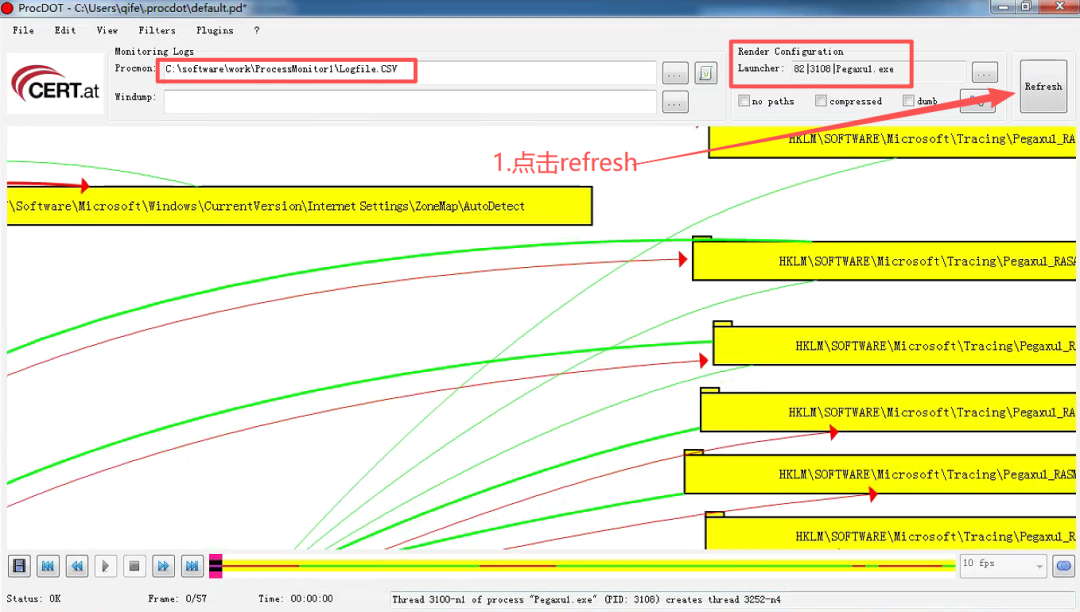 1.运行procdot,在Procmon选项中选择procmon导出的日志、在Windump选项中选择wireshark网络流量数据包,在launcher中选择恶意软件进行,然后点击Refresh即可生成恶意软件的日志图像,如下所示: