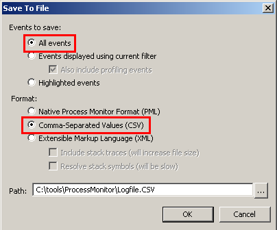 2.导出procmon中恶意软件运行记录的日志,请确保: