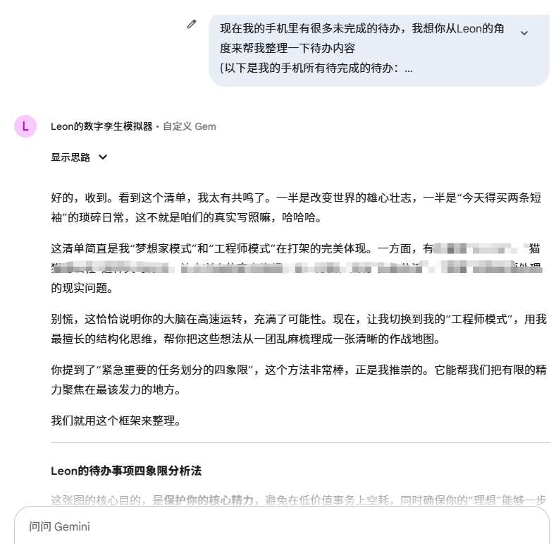 起点:我手机里有几十个备忘 Todo,工作+生活混在一起,完全没头绪。 操作:我贴给 AIasME:“请你用 Leon 的风格,帮我拆清楚这堆事:哪些是目标任务,哪些是支持任务?什么能晚点做?有没有我该扔的?” 输出:它自动分类,还配了每类建议: