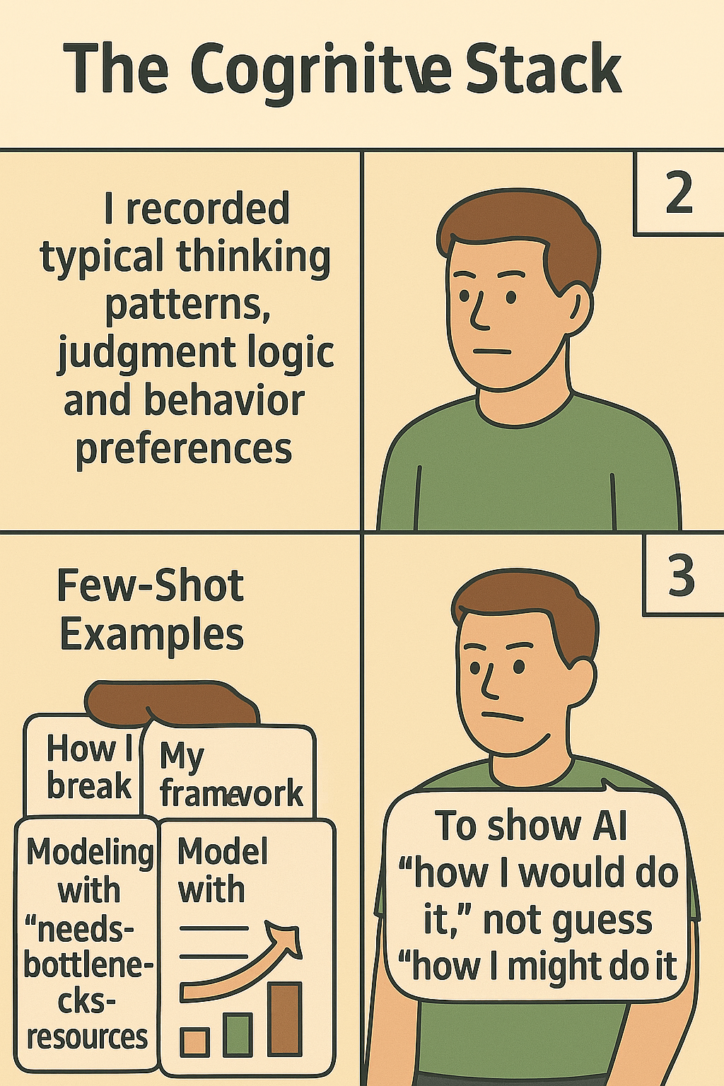 【如何填写】 用几个“few-shot”示例,告诉AI你面对不同场景(如学习、困难、选择)时,一步步的思考流程。
