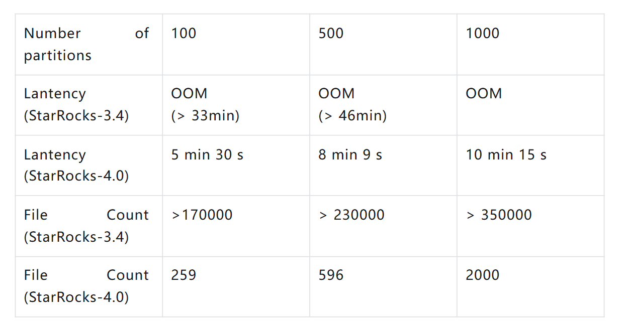 这一机制避免了因防止 OOM 而过早生成小文件的问题,使数据文件更接近理想大小,即使在上千分区的复杂写入场景下,仍能保持稳定、高效的性能表现。