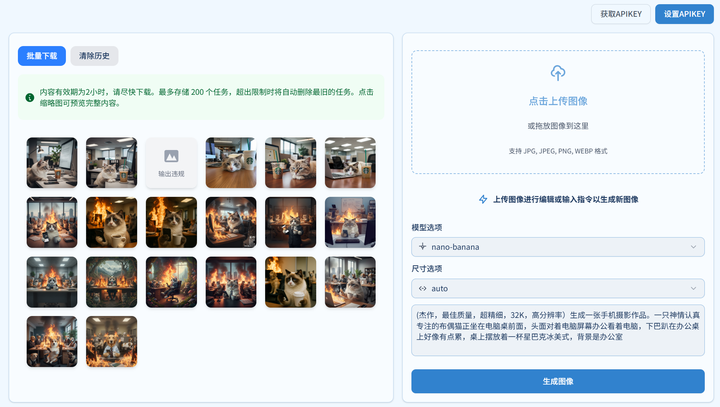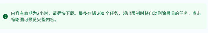 需要特别注意的是它保存机制:生成的内容有效期为2小时,需要及时下载。并且系统最多保留200个任务,超出会自动清理最早的任务。