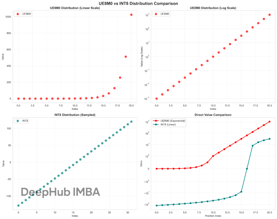 简单来说,UE8M0就像一个"变焦镜头",能够自动调节精度来适应不同数量级的数据;而INT8像一个"定焦镜头",在固定范围内提供稳定一致的精度。