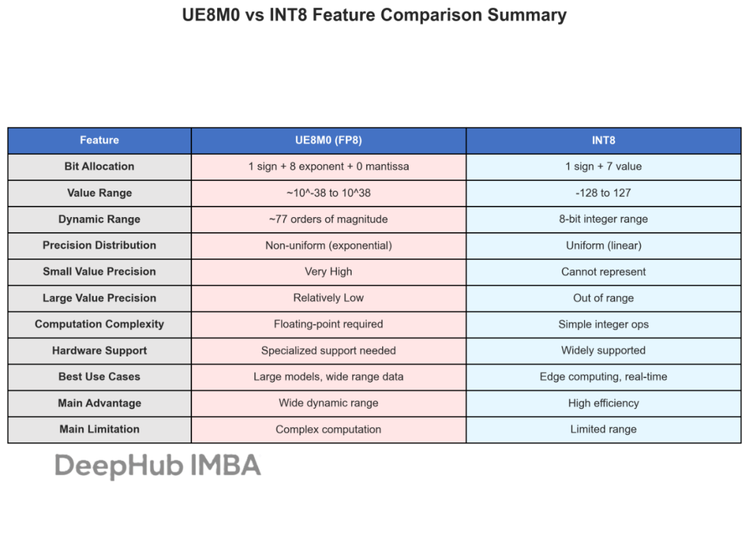 图4: UE8M0与INT8的全面特性对比总结表