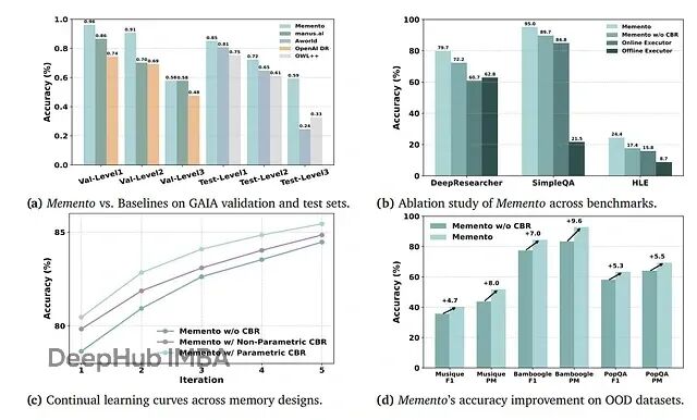 实验结果显示Memento在GAIA验证集上取得第一名(87.88% Pass@3),在私有测试排行榜上达到79.40%的成绩。在DeepResearcher数据集上实现66.6% F1分数和80.4% PM指标,超越了当前最先进的基于训练的系统。基于案例的记忆机制在分布外任务上带来4.7到9.6个绝对百分点的提升,在SimpleQA基准上达到95.0% PM。