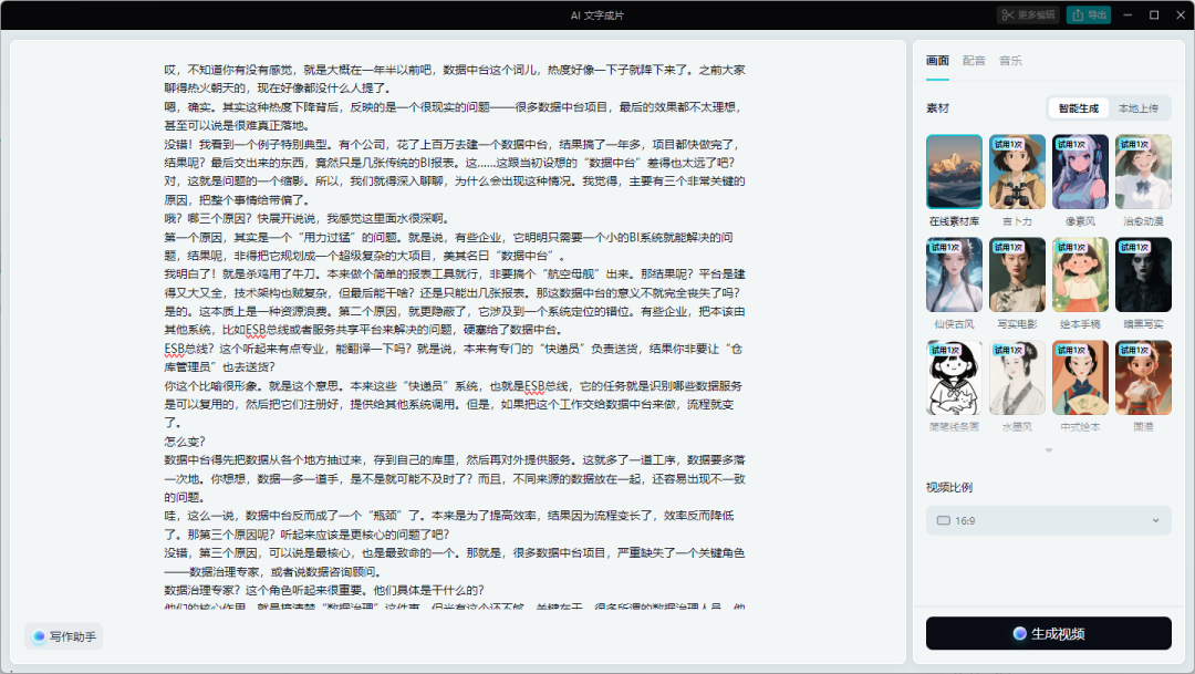 所以在这里可以使用剪映提供的AI文字成品功能来基于文字稿输出完整的视频,你既可以选择数字人,可以选择在线的素材库来进行生成。