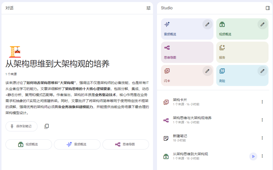接着我们再来讲下Google NotebookLM,这个Google提供的基于大模型的可视化笔记记录功能相当强大。即可以基于你提供的文章帮你输出音频,视频,思维导图,学习测验等多种形式。