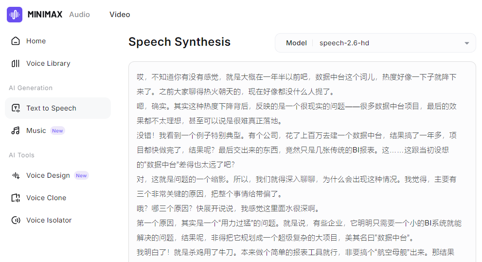 在前段时间看到minMax做了开放和升级。原来实际我们用过minMax的通用智能体和深度研究功能。现在minMax又推出了完整的文本转语音功能。你只需要准备完整的文字稿即可,minMax完全转为语音并且可以下载。