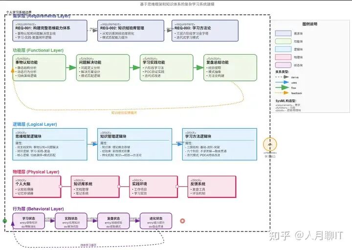 架构图以“个人学习系统边界”为外框,内部采用分层结构组织核心要素:需求层、功能层、逻辑层、物理层与行为层。四层协同、端到端闭环,强调“目标—能力—方法—工具—行为”的一致性,并用“派生、使用、流程、反馈”等工程语义串联起各节点。学习不是孤立环节,而是贯穿双主线与闭环的持续输入;复盘不是结束,而是将输出转化为可复用资产的关键动作;知识库不只是存储,而是连接过去与未来的“弹药库”。