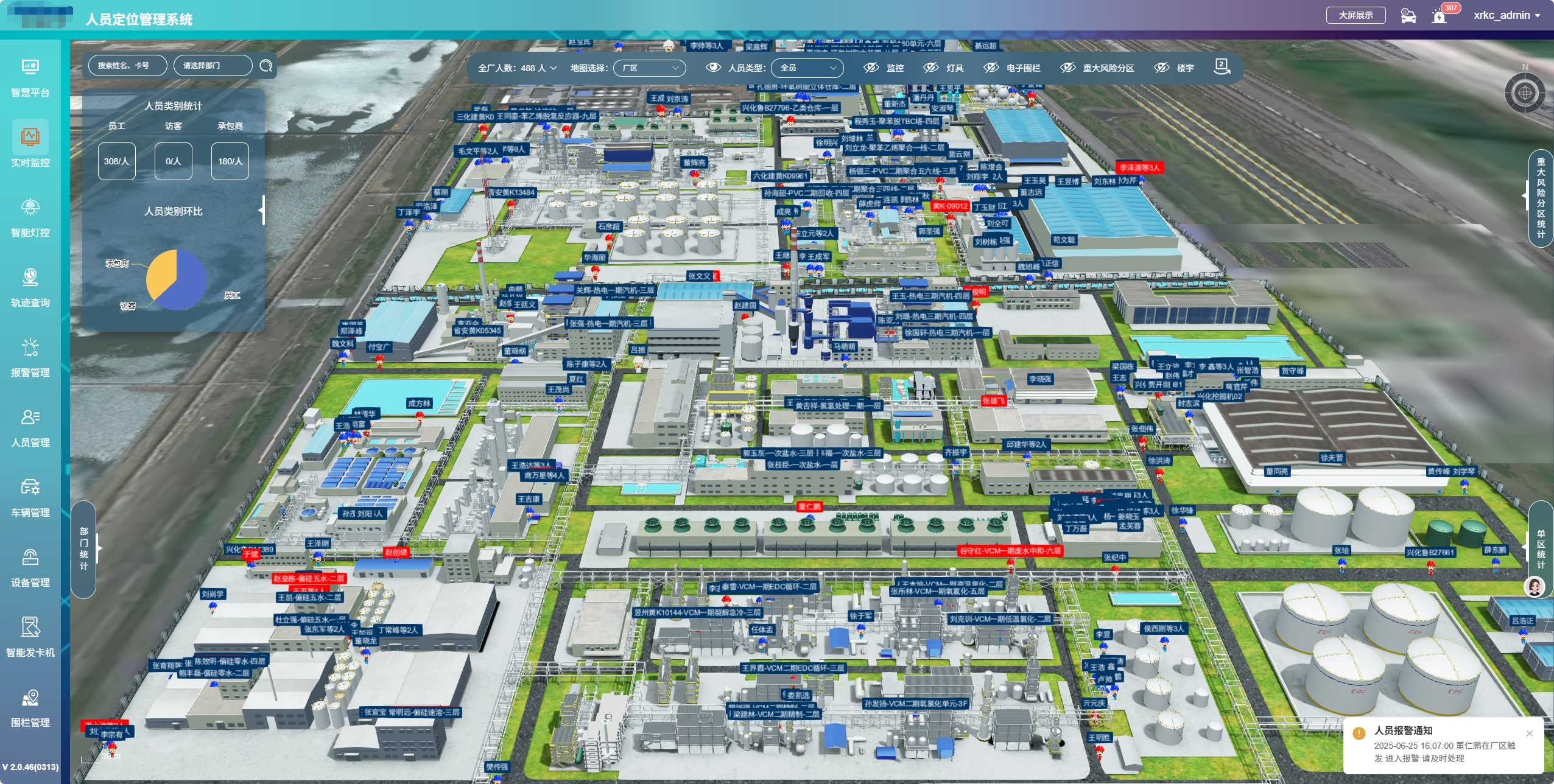结合石油化工厂实际的生产区域划分,管理人员可在管理平台上自定义设置各类电子围栏。一旦有人员或车辆靠近甚至闯入危险区域,系统会立即触发警报,并向管理人员发送告警信息,详细告知违规人员或车辆的身份信息、进入时间以及违规区域,以便管理人员及时采取措施制止,防止事故发生。对于核心技术区、设备维修区等非授权人员禁止进入的区域,可设置限制区域围栏,实现严格管控。