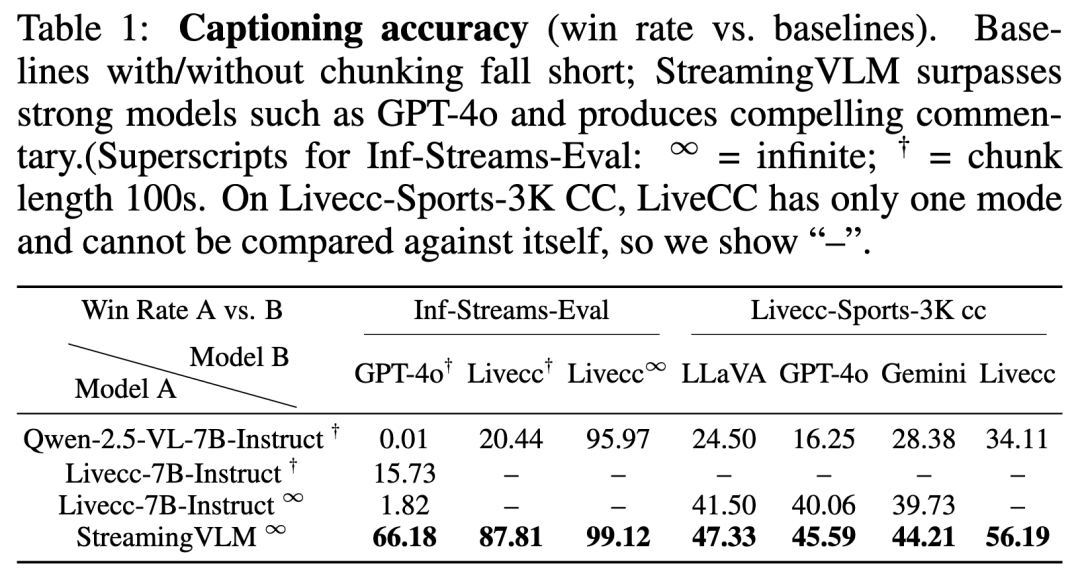 相比之下,StreamingVLM 以无限模式运行;其长期记忆和流式视频感知能力使其具有明显优势,在解说质量上超过了 GPT-4o mini。下图2(所示图)展示了一个真实案例,其中 StreamingVLM 保持连贯输出、实时延迟和长期记忆,解决了无限视频流实时感知的核心挑战。在 LiveCC-3K-Sports-CC 上,StreamingVLM 也优于基线,展示了在不同长度视频上的稳定流式字幕生成能力。