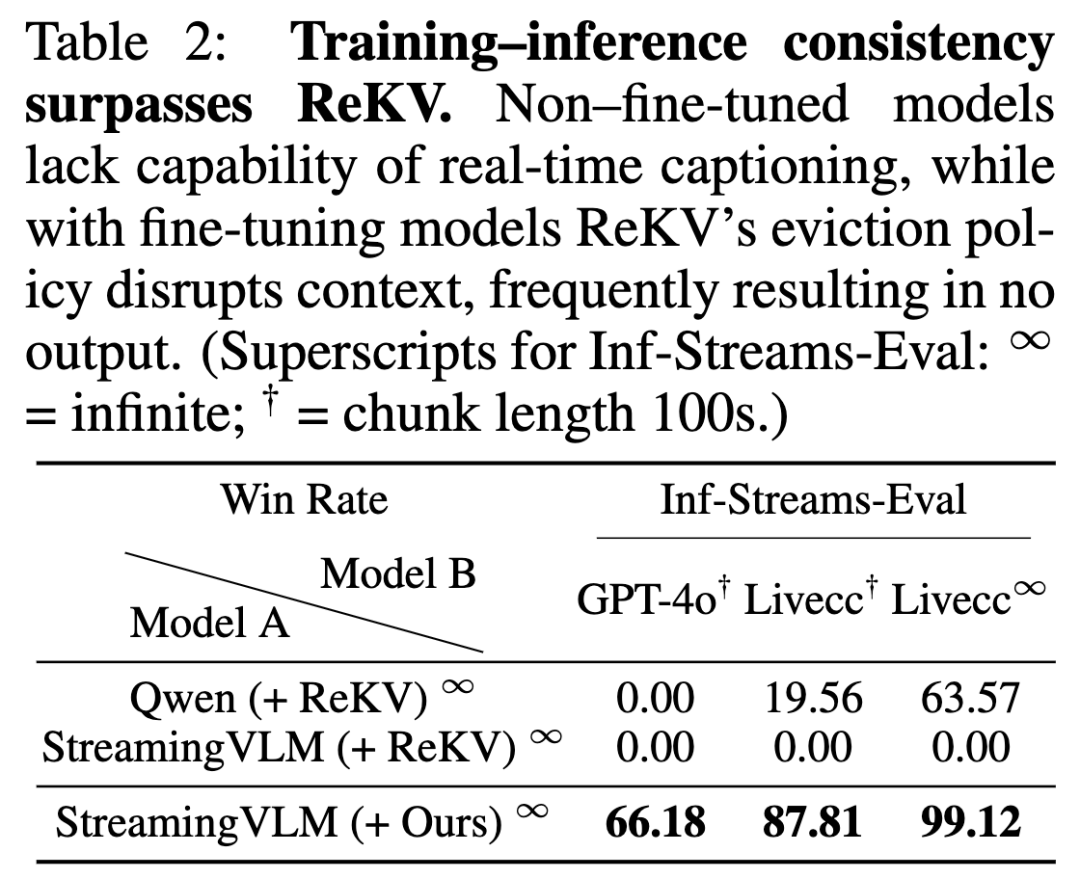 首先在字幕生成任务上将我们的推理策略与 ReKV 进行比较。我们观察到一个无训练的 ReKV 悖论:未经过任务特定微调的模型表现较差,而经过特殊微调的模型(例如 StreamingVLM)依赖于固定的上下文格式,而 ReKV 的淘汰策略会破坏这种格式,常常导致没有输出。相比之下,StreamingVLM 的训练–推理一致性设计解决了这个问题。