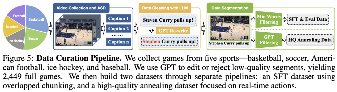 上述数据集可以微调模型的实时视频理解能力。然而,它包含大量关于球队信息和赛季历史的内容;对于解说任务的人类体验而言,我们更希望模型提供对场上事件的实时解说。因此,我们创建了高质量退火数据。