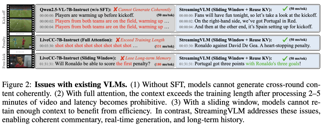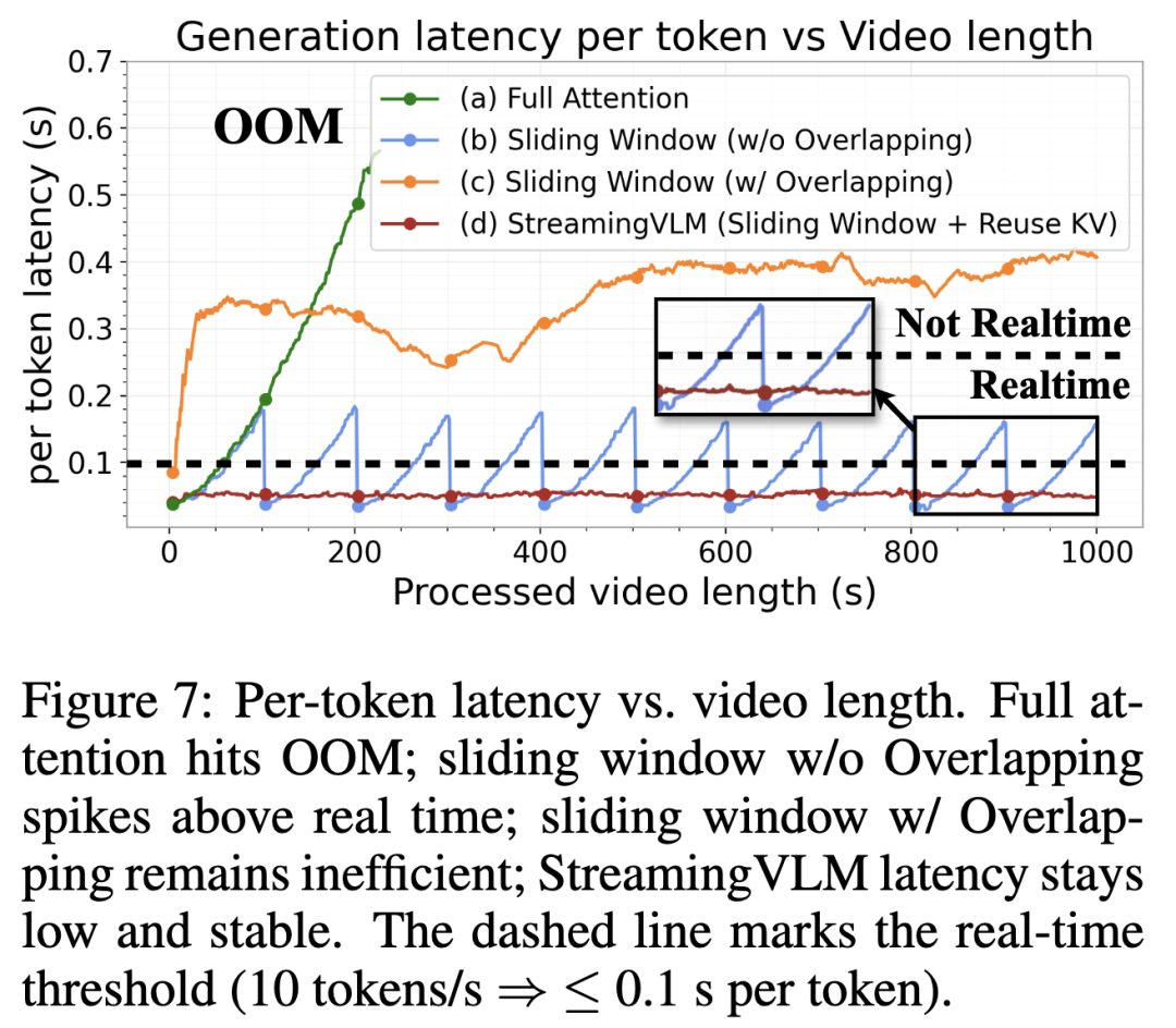 实时响应要求延迟低于虚线所示的固定阈值。全注意力很快超过限制并导致显存溢出(OOM)。滑动窗口(无重叠)需要较大的块以保持连贯性,因此显示出周期性延迟模式:在每个块的开始阶段,模型重建上下文,导致解说与过去内容不连贯;在块的后期,延迟急剧上升,无法满足实时需求。滑动窗口(有重叠)由于计算冗余,效率仍然较低。StreamingVLM 保持固定上下文长度并重用 KV,维持较低且稳定的延迟,并能在单个 NVIDIA H100 上以 8 FPS 支持实时解说。