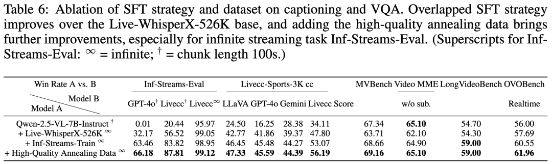 SFT 策略 如下表 6 所示,采用重叠训练策略后,SFT 子集帮助模型适应交错的视觉–文本模式,并理解超长视频。与仅在 Live-WhisperX-526K 上训练的模型相比,在重叠 SFT 数据上训练的模型增强了对无限视频的感知,在 Inf-Streams-Eval 上相较 GPT-4o-mini 的胜率提升 +31.29,在 Livecc-Sports-3K cc 上相较 LLaVA-Video-72B-Qwen2 的胜率提升 +3.68。