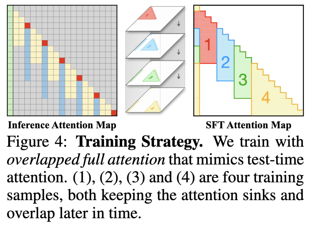 如图 4 右侧面板所示,这种重叠的全注意力监督与推理时的有效注意力模式——即注意力汇聚(sink)、最近文本的较长窗口以及最近视觉的较短窗口——高度近似。训练监督与测试时上下文的对齐,使模型学习到预期的时间新近偏好(recency bias),并在无需在计算量呈二次增长的超长上下文上训练的情况下实现稳定的流式行为。