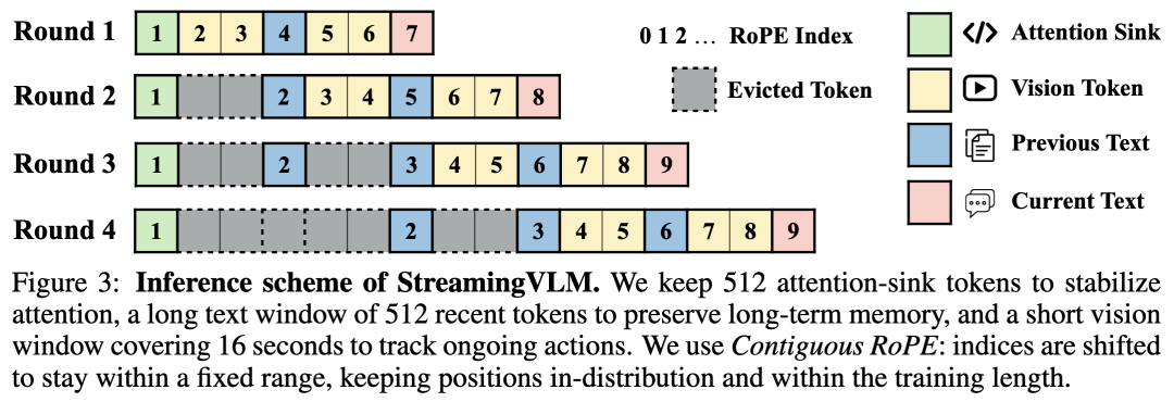 连续 RoPE为了防止在移除后出现位置漂移,应用了连续旋转位置嵌入(RoPE)。当较早的 token 被移除时,后续和新进入的 token 的 RoPE 索引会被平移,以便其位置在数值上与最后保留的 token 连续。 一旦视频长度超过总窗口大小,有效的 RoPE 索引将停止增长并保持在一个有界范围内。这使得位置值保持在分布内,从而稳定长时流式推理。