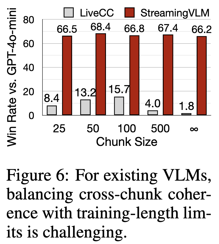 然后,在 LiveCC-3K-Sports-CC 和 Inf-Streams-Eval 上评估了 StreamingVLM、Qwen-2.5-VL-7B-Instruct 和 LiveCC-7B-Instruct。如下表1 所示,在 Inf-Streams-Eval 上,Qwen-2.5-VL-7B-Instruct 无法保持连续解说,因此表现较差。LiveCC-7B-Instruct 在分块推理下表现更好。下图6 进一步显示,短块会破坏连贯性;这些设计不支持无限推理,而使用长块时,很快会超出训练长度并导致退化。