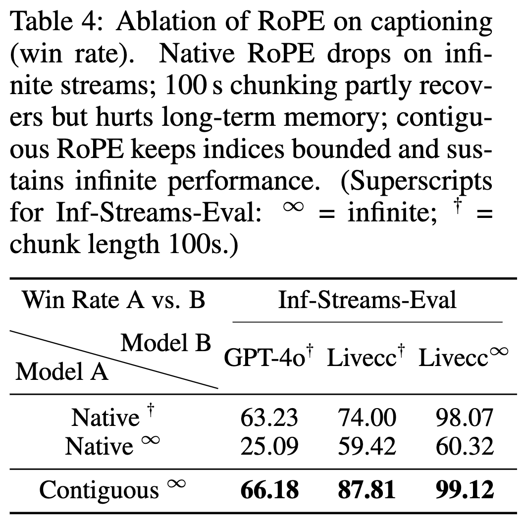 本文研究了连续 RoPE 索引的效果。由于训练时使用全注意力,训练中仅使用原生 RoPE。在推理时,比较了连续 RoPE 与原生版本。如下表 4 所示,原生 RoPE 在无限流上性能急剧下降,因为其索引增长过快并超出训练范围。将视频分割为 100 秒的块可以部分恢复准确率,但会损害长期连贯性。使用连续 RoPE 时,位置索引保持有界,因此模型能够在无限推理下保持性能不损失。