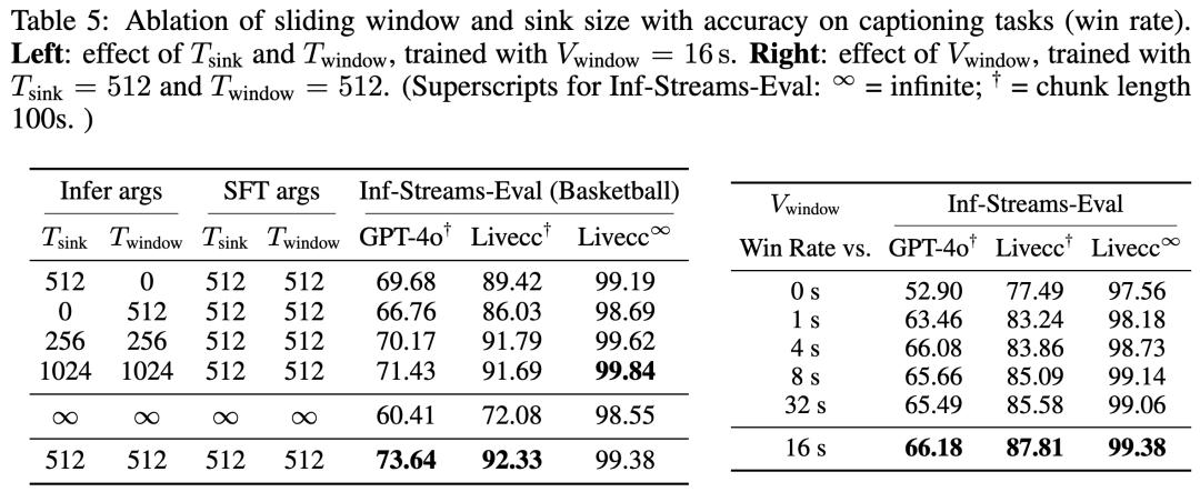 首先,下表 5 左表对注意力 sink 和文本窗口的长度进行了消融实验。这里 和 分别是训练和推理中保留的先前注意力 sink 和文本窗口的长度。我们取 SFT 数据的篮球子集并训练两个模型:一个使用文本清除( 和 ),一个不使用清除。在 Inf-Streams-Eval(篮球子集)上,我们根据各自匹配的策略(清除 vs 不清除)评估每个模型。表 5 左表显示,对于无限推理,清除先前的文本 token 很重要并能提升性能。