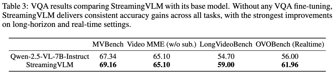 在四个 VQA 任务上评估了 StreamingVLM 及其基础模型 Qwen-2.5-VL-7B-Instruct。如下表3 所示,即使没有任何 VQA SFT,StreamingVLM 在所有任务上都优于基础模型,表明我们的 SFT 改善了通用视觉能力。OVOBench Realtime 测试模型对即时流式场景的理解。在这个流式感知任务上,StreamingVLM 提升了 5.96%。这突出了 Inf-Streams-Train 及我们训练策略的优势,增强了模型的核心能力。