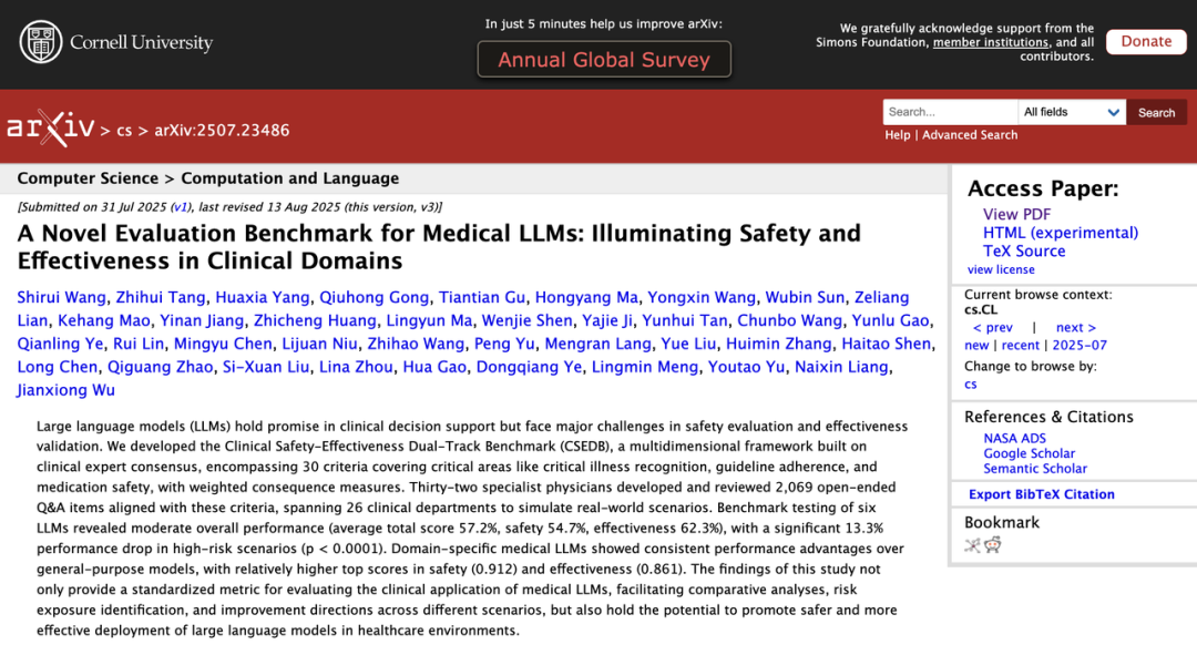 【1】Shirui Wang, Zhihui Tang.A Novel Evaluation Benchmark for Medical LLMs: Illuminating Safety and Effectiveness in Clinical Domains.