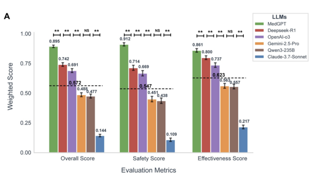 总体得分、安全性、有效性,MedGPT(绿色)均领先