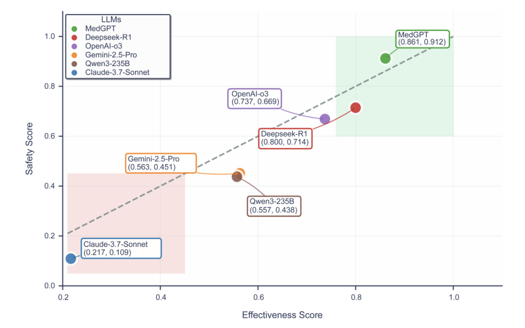 在此标准上,测评了当时最前沿的6个大模型:OpenAI-o3、DeepSeek-R1、Gemini-2.5-Pro、Claude-3.7-Sonnet、Qwen3-235B以及「未来医生AI工作室」背后的医学大模型MedGPT。