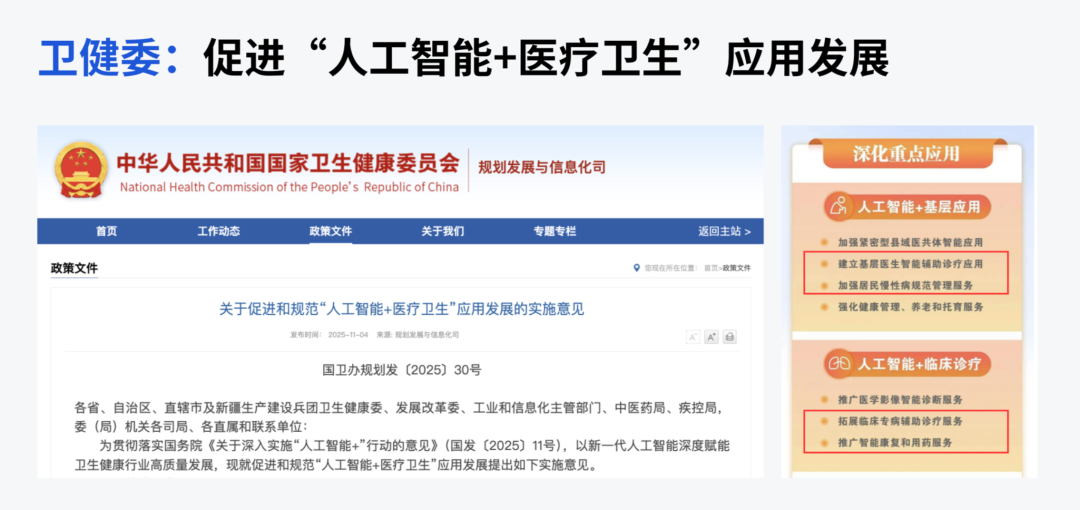 11月4日,国家卫健委正式发布《关于促进和规范人工智能+医疗卫生应用发展的实施意见》,其中重点提到: