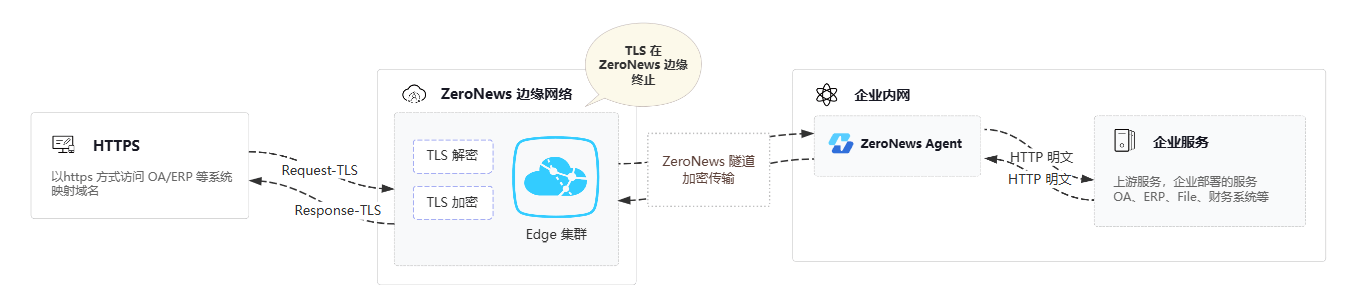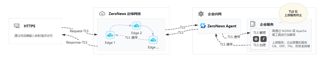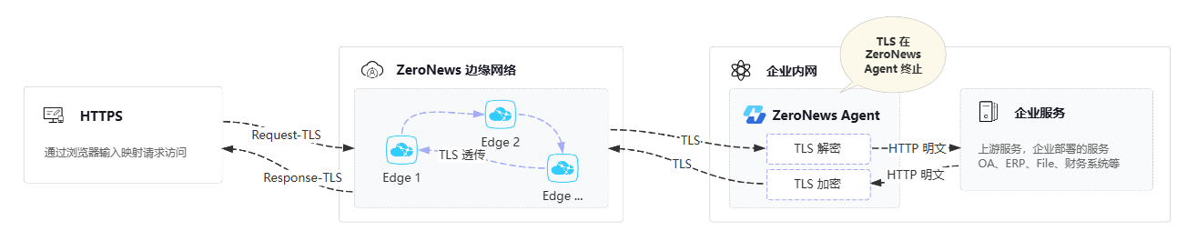 如果您选择在ZeroNews agent 客户端侧处理tls流量(官方术语为 Agent TLS终止), 即ZeroNews网络层(边缘节点)无法看到经过您映射的真实数据内容,而是会将加密流量直接传输给您部署在内外的ZeroNews agent, 由ZeroNews agent处理TLS流量的解密验证工作,这种方式需要提供一些额外配置,我们在官方文档中有对该模式进行详细配置指引