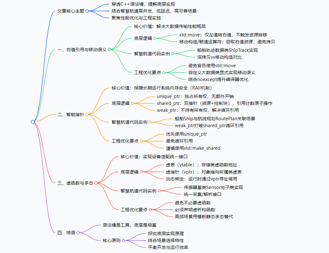 C++相信大家都不陌生 ,它凭借其高性能、底层可控性成为了一门核心的开发语言。在我做过的智慧航道项目中,从船舶动态轨迹追踪到航道环境实时监测,从海量传感器数据处理到智能避障算法执行,每一个核心模块都对程序的可靠性、效率提出了极致要求。然而,C++ 丰富的语法糖在简化开发的同时,也容易让开发者陷入 "知其然不知其所以然" 的困境。只有穿透语法糖的表象,理解其底层实现机制,才能在智慧航道这种高并发、低延迟、高可靠的场景中,写出经得起考验的代码。所以这篇文章我想结合智慧航道的实际应用场景,通过具体代码实例,剖析 C++ 核心语法糖的底层逻辑,并探讨其在工程实践中的优化思路。
