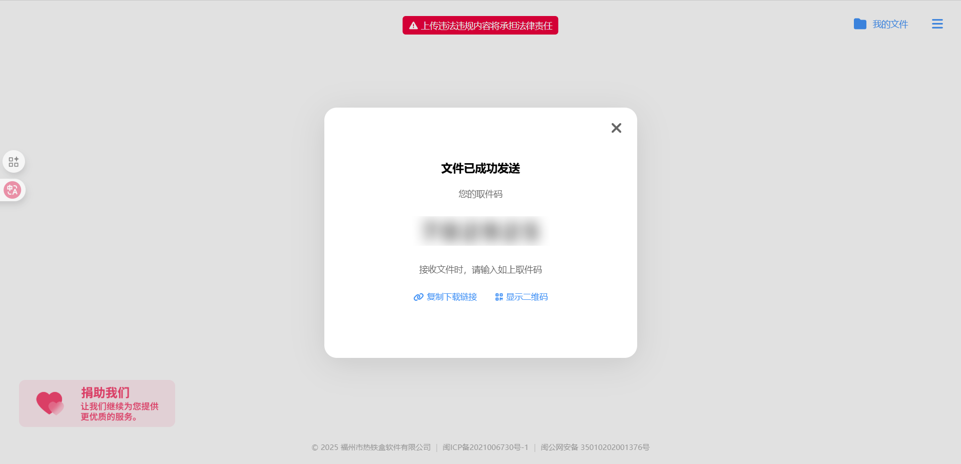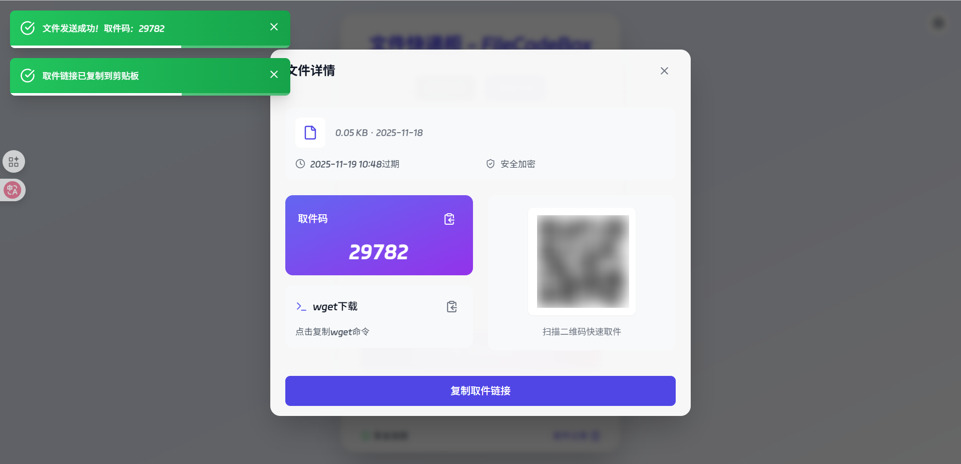 发送成功后会有下载链接与二维码显示,还有取件码,注意保存。