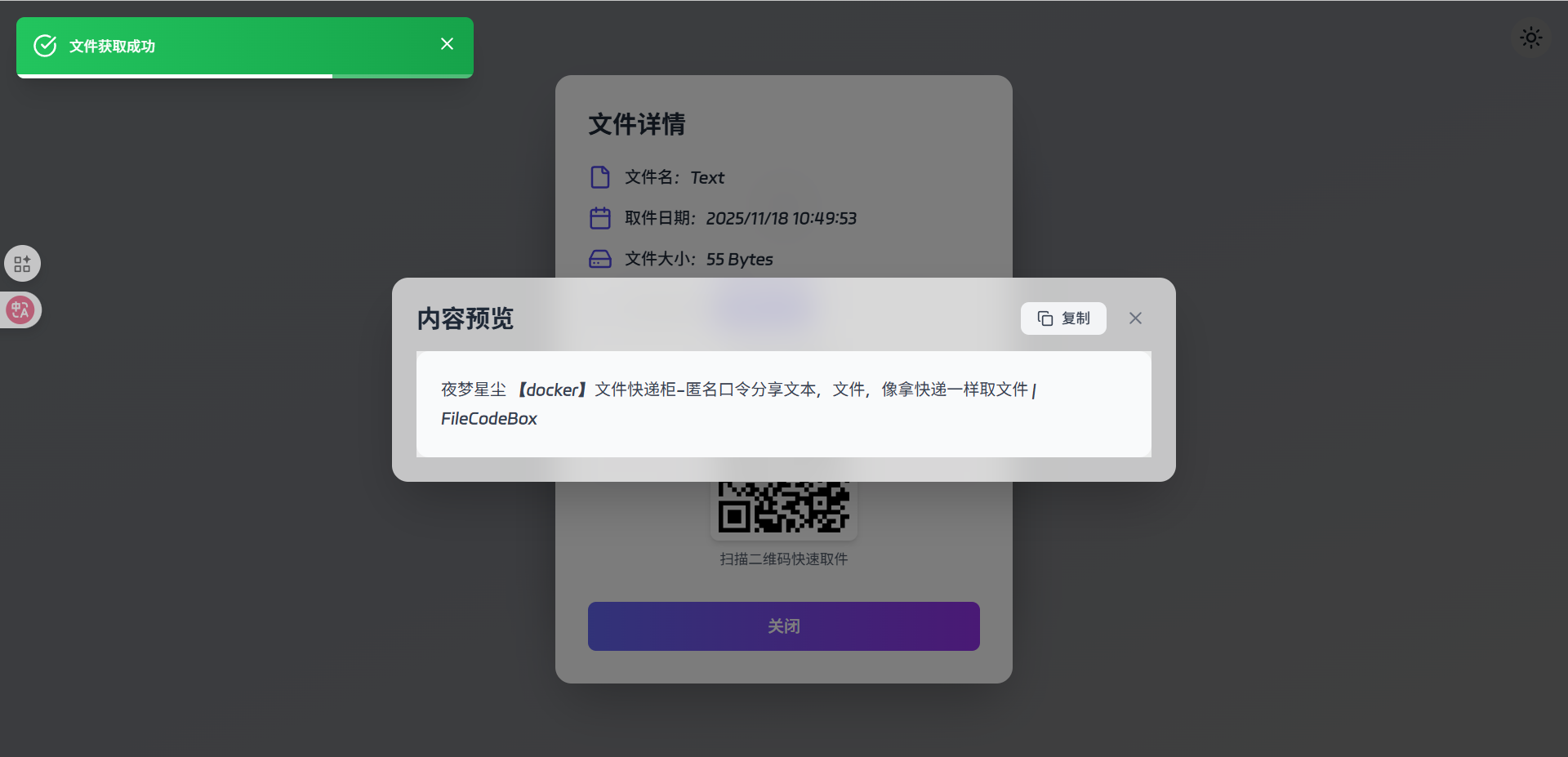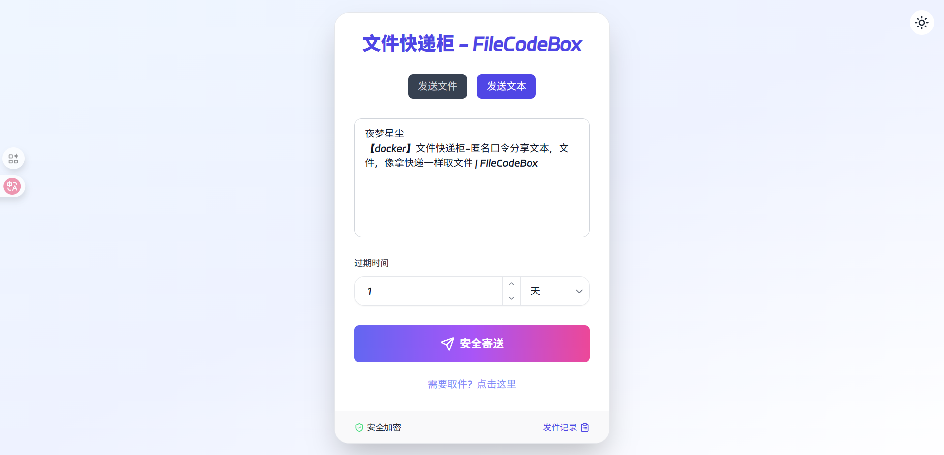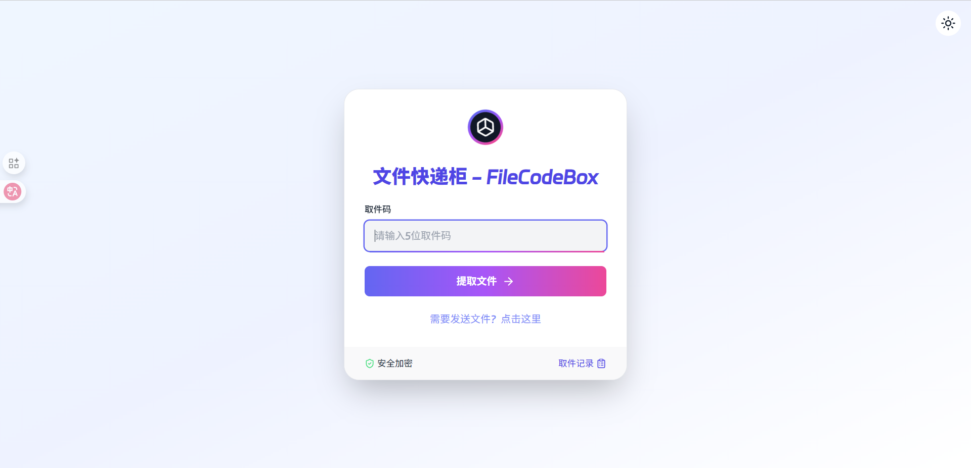 这段时间夜梦发现了一个好用的“文件快递柜”,作者给它的名字是FileCodeBox,可以和空投快传一样实现我的需求。