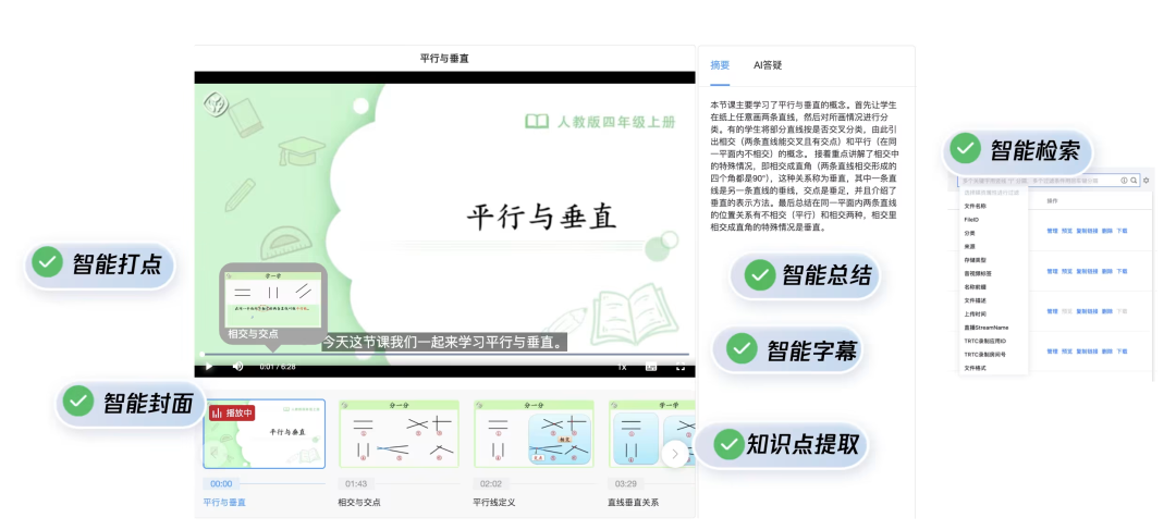 在内容管理方面,腾讯云云点播(VOD)覆盖音视频采集、上传、转码、存储、分发、播放全流程。用户可以通过智能媒资能力,完成智能打标、内容解析、结构化编目等精细化管理,将非结构化素材,转化为可以用自然语言高效检索的资产,秒级定位内容。此外,平台集成了直播转点播、智能审核、媒体处理等能力,帮助客户大幅简化业务流程,降低运营成本。