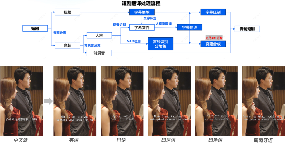 以短剧行业为例,腾讯云音视频的一站式媒体智能解决方案,帮助短剧头部客户快速实现超100种语言的本地翻译,真正做到“一次创作,多地传播”。