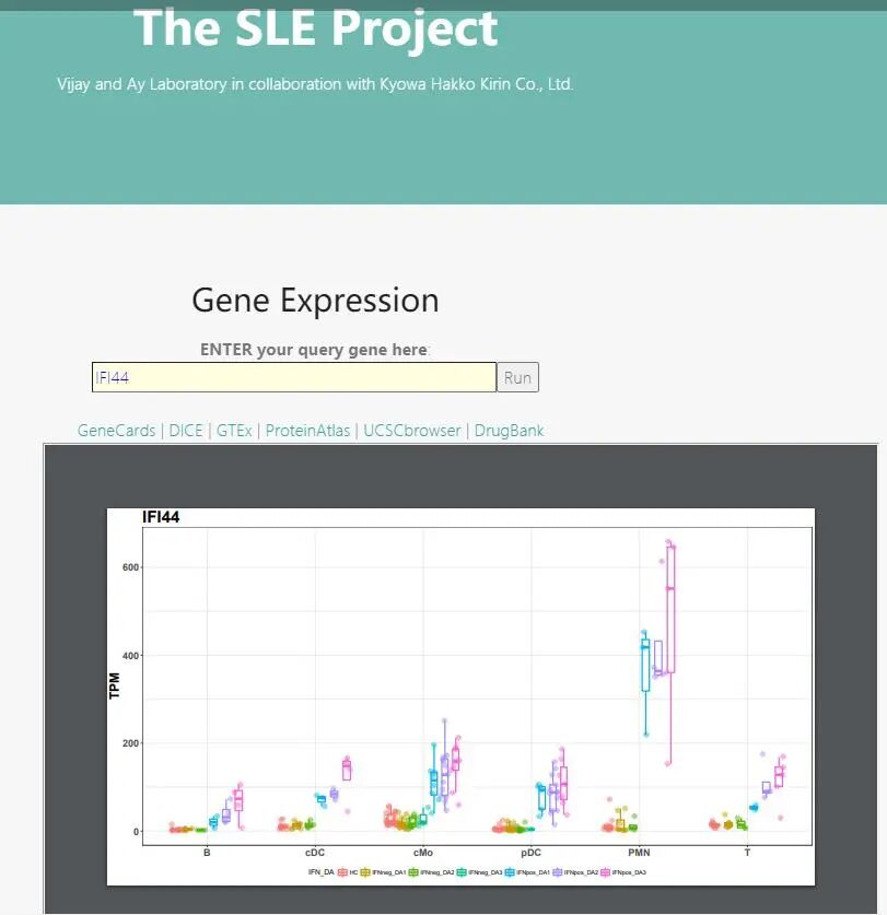 1.查看基因在不同免疫细胞中的表达:登录网站后,在输入框输入目的基因如干扰素刺激基因IFI44,点击运行按钮RUN,在图片框便可出现IFI44在健康人群与SLE患者血液细胞(B细胞,循环DC细胞,循环单核细胞cMO,外周DC细胞(pDC),多型中性粒细胞PMN以及T细胞)干扰素高低表达患者组之间不同SLEDAI疾病指数之间基因表达情况。图片可下载为PDF格式。另外,点击GeneCard(基因注释),DICE(在免疫细胞中表达),GETX(不同组织中表达),ProteinAtlas(蛋白组数据库),UCSC,Drugbank(药物)可以查看该基因的相关功能表达等情况。