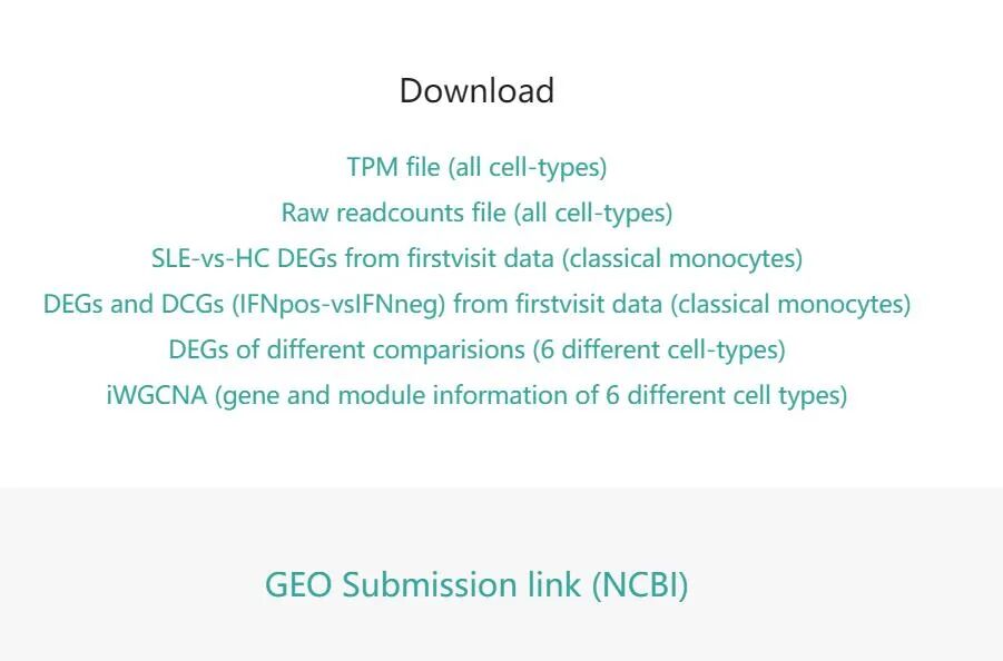 2.下载基因表达相关文件:在网页底部是下载链接。可以下载TPM标化后的表达谱数据、SLEvsHC 差异基因数据、干扰素高低组差异基因、细胞类型间差异基因、多细胞加权基因共表达分析结果以及GEO数据链接。