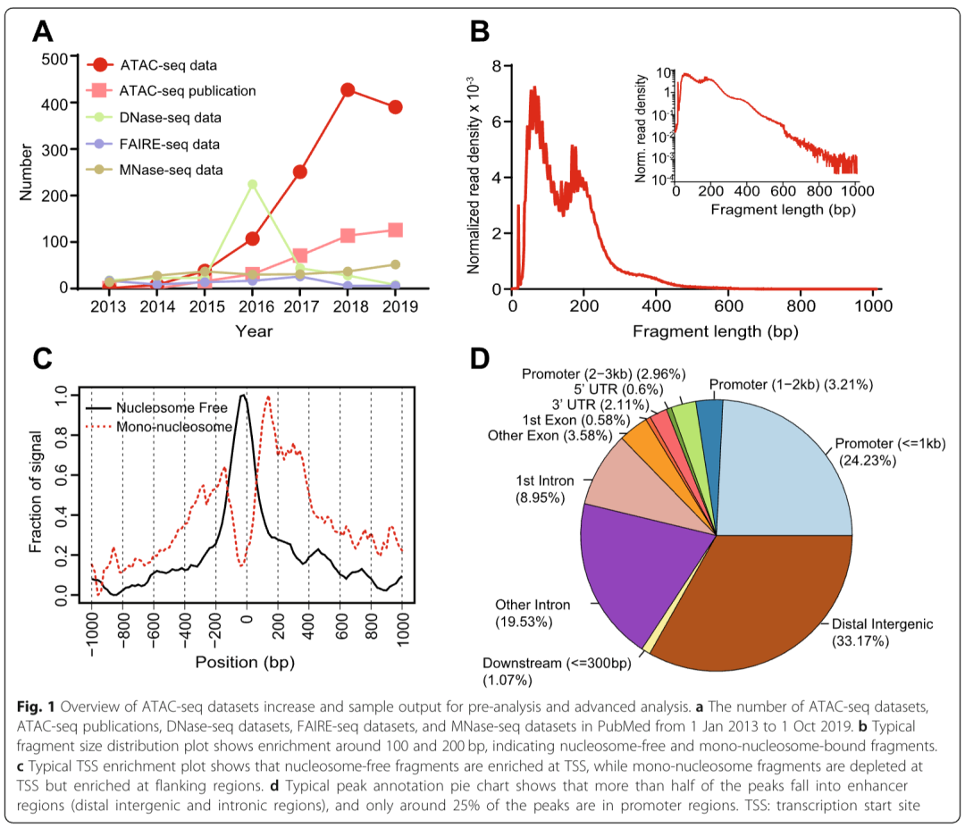 总结一下,我们建议 ATAC-seq 数据处理的开始流程为:FastQC→trimmomatic→BWA-MEM→ATACseqQC。根据我们的经验,这一流程表现良好。