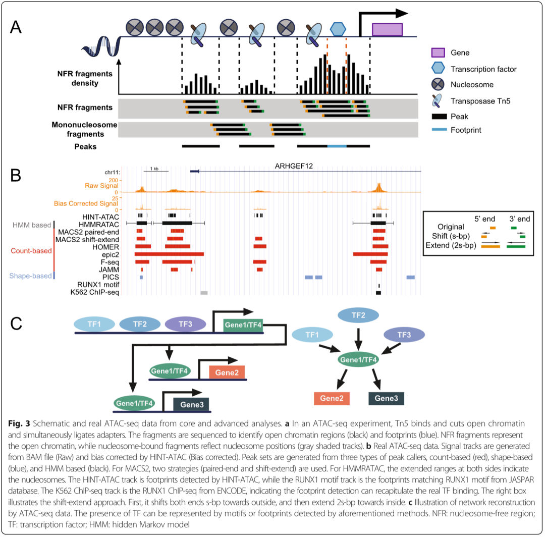已有研究开发出用于检测这些核小体相关片段富集区域的分析工具。然而,Schep 等人表明,由于开放染色质区域之外的读数覆盖率较低,ATAC-seq 中的核小体检测比 MNase-seq 数据更具挑战性 [149]。目前,两种有用的 ATAC-seq 核小体检测专用工具是:HMMRATAC 和 NucleoATAC。