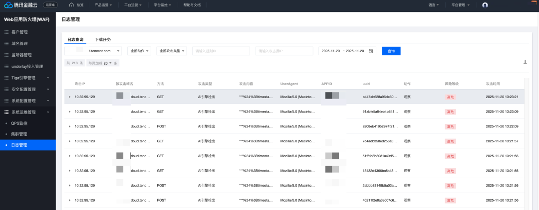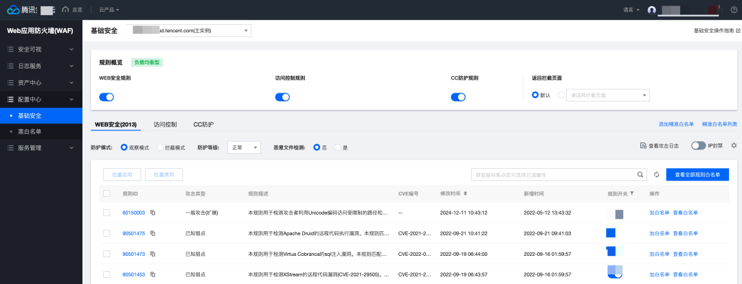 WAF防护可根据预设规则自动拦截携带恶意代码的HTTP请求。支持观察模式和拦截模式灵活切换,确保业务连续性的前提下实现主动防御。