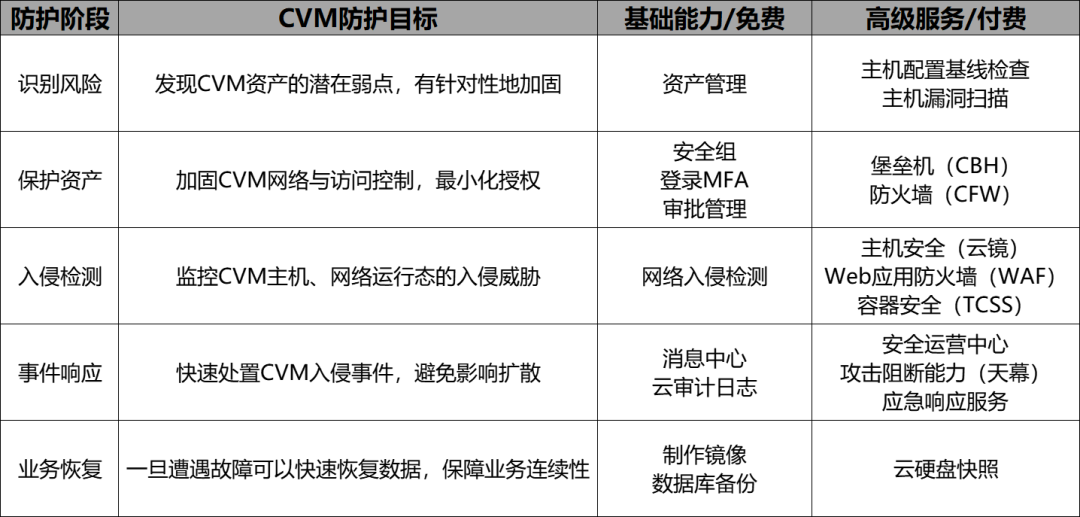 腾讯专有云TCE(Tencent Cloud Enterprise)通过构建覆盖“识别-保护-检测-响应-恢复”全周期的安全闭环体系,并允许客户根据自身的安全需求、业务阶段和预算,阶梯式地选择相应的安全工具。下表清晰地展示了TCE如何在不同安全阶段提供的相应工具和能力,帮助客户快速构建全面的防护视角。