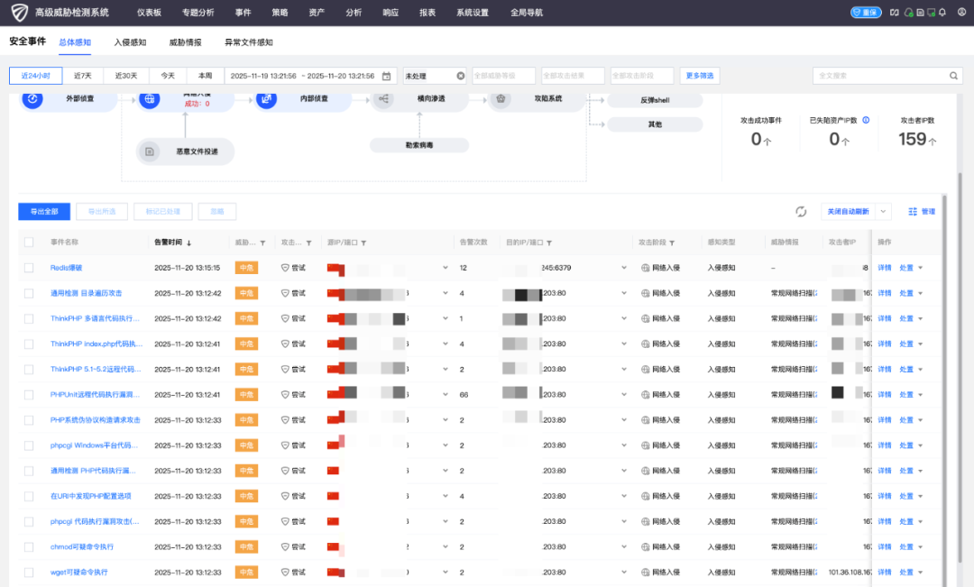 通过网络流量镜像与深度解析,高级威胁检测系统(INTA)可有效识别网络中的攻击尝试、横向移动、C&C通信、数据窃取等恶意行为,并结合时序分析与特征交叉技术,能够发现特定IP对关键路径的攻击行为,从而精准识别网络中的僵尸网络、挖矿活动、隐蔽通信等攻击威胁。