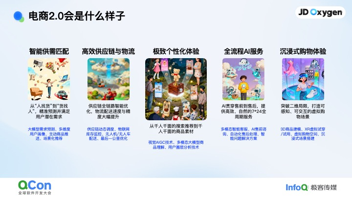 商品贸易的起源其实可以追溯到很早,据考证公元前 7000 年就已经出现了商品交易的雏形,但今天我们仅聚焦过去的一百年就好,20 世纪 60 年代以前,我们所有的交易都是发生在线下的,因为那个时期还没有真正意义的计算机出现,甚至 60 年代还经常可以看到一部分的物物交换。后来随着计算机技术的发展,EDP/EDI 技术的出现,电子商务正式进入了萌芽阶段。后面的故事,有很多大家都比较清楚了,上个世纪 90 年代出现了因特网,也正是在那个时期诞生了亚马逊、京东、阿里巴巴这样的线上交易平台。2005 年之后,伴随着移动互联网的浪潮,货架电商、内容电商纷纷展露出自己的竞争力,大家对流量的争夺也逐步进入了白热化,这个时期也出现了“千人千面”的搜索推荐,保守一些,我们姑且把这一阶段定义为电商的 1.0 时代。2022 年是不同寻常的一年,这一年年底出现了 ChatGPT,出现了 Midjourney,在大模型、具身智能、3D/XR 等新技术的涌现下,电商正式迈进了它的 2.0 时代,那么这个时代的电商会有什么体验和效率方面的进化呢,接下来我分享一下自己的理解。
