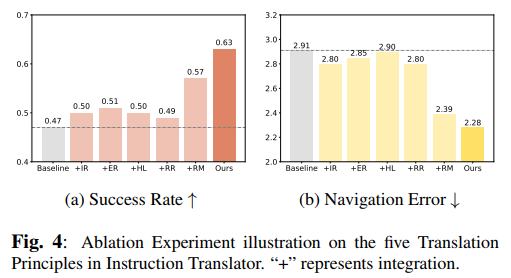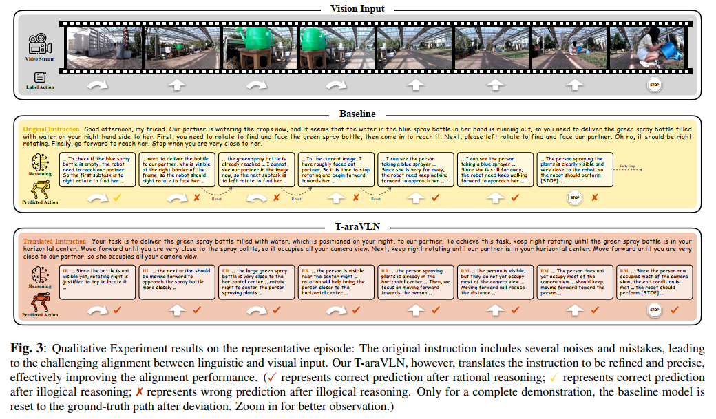 通过代表性案例(图3)展示 T-araVLN 的翻译效果。原始指令中包含大量冗余和错误,导致语言与视觉对齐困难。经过翻译后,指令变得更加清晰和准确,显著提升了对齐质量和导航效果。
