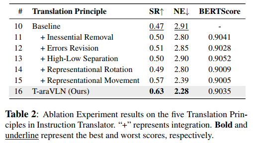 除传统的成功率(SR) 和导航误差(NE) 外,本文引入 BERTScoreF1以衡量原始指令与翻译后指令之间的语义相似度。该指标用于评估翻译的激进程度:分数越低表示修改幅度越大,翻译策略越激进;分数越高则修改越保守。