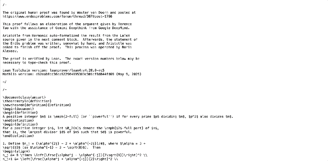 两天后,数学家 Boris Alexeev 使用 Harmonic 的 Aristotle 工具完成了该问题的 Lean 形式化,并手动形式化了最终的命题,以防止 AI 的滥用。这个过程花费了两到三小时,输出结果如下所示: