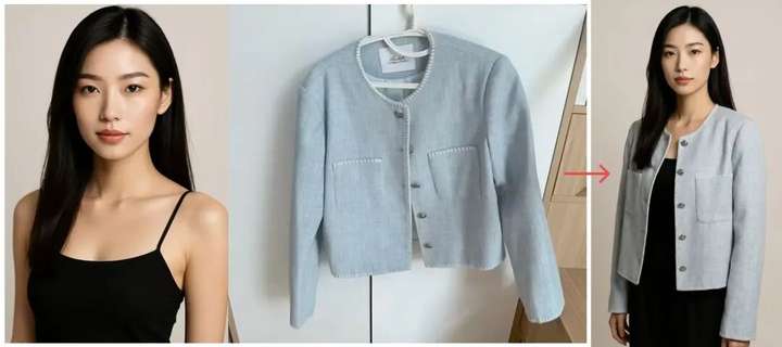 提示词:使用图1(服装)和图2(模特),拍摄一张超逼真的全身时尚照片,模特需穿着该服装。关键合身细节:[T恤/外套]必须自然垂坠于模特身上,贴合其身形,并呈现逼真的褶皱。高保真还原:极其精确地保留图1中的原始面料纹理、颜色和所有标识。无缝融合:通过完美匹配环境光线、色温和阴影方向,将服装与图2无缝衔接。摄影风格:简洁的电商产品图册风格,使用佳能EOS R5相机和50mm f/1.8镜头拍摄,呈现自然专业的视觉效果。