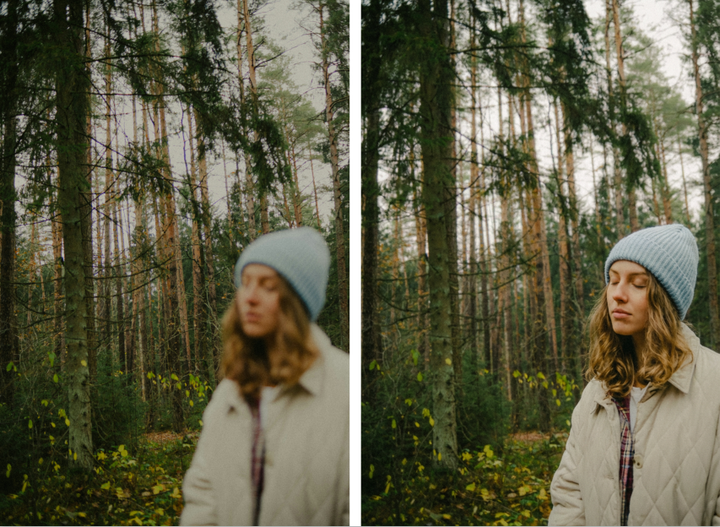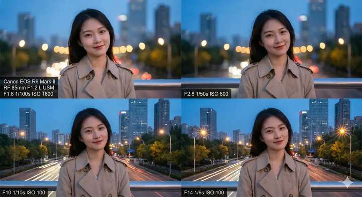 提示词:佳能相机,85mm 定头,生成 1.8F、2.8F、10F、 14F 光圈逐渐变化的效果,温柔大美女作为模特,背景是黄昏之后的城市蓝调时刻