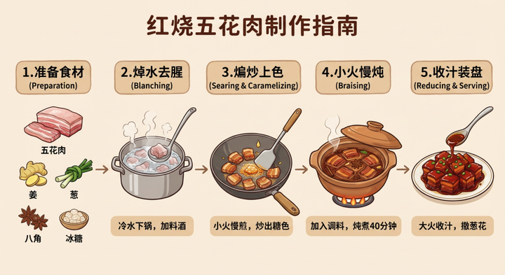 提示词:制作一张信息图,展示如何制作红烧五花肉